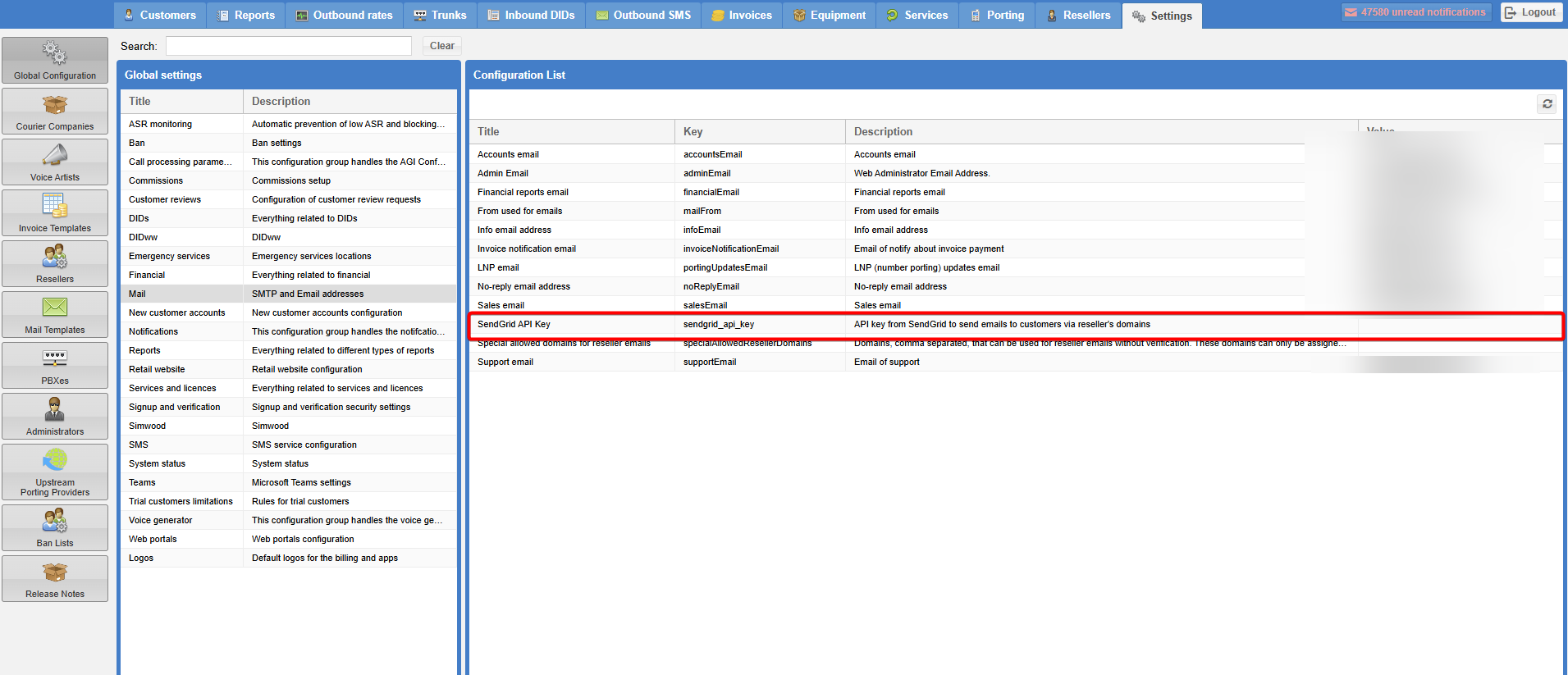 8. Create and copy a SendGrid API key and add it to your Wholesale Portal settings by going to Global Configuration > Mail > SendGrid API Key.